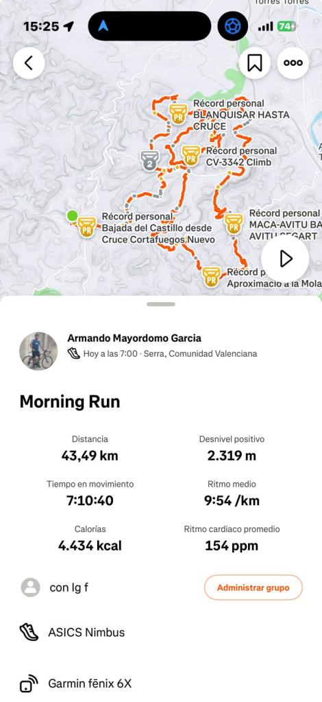 Lo gordo, al menos en pantalla, fue la cosecha de récords personales. Armando batió su mejor marca en cinco segmentos de Strava en una sola carrera: Blanquisar hasta el cruce, la subida CV-3342, la bajada del Castillo desde el cortafuegos nuevo, MACA-Avitu y la aproximación a La Mola. Cinco PRs. La pantalla parecía una máquina tragaperras dando premio en cada tirada. Ahora bien, conviene aclarar para los no iniciados en la liturgia de Strava que un «récord personal» significa que es tu mejor marca en ese segmento, y que si nunca has corrido ese segmento, la primera vez que lo haces es automáticamente tu récord personal. Podrías ir andando, pararte a hacer fotos del paisaje, comerte un plátano y llamar a tu madre, y Strava te regalaría igualmente la copita dorada y la fanfarria digital.