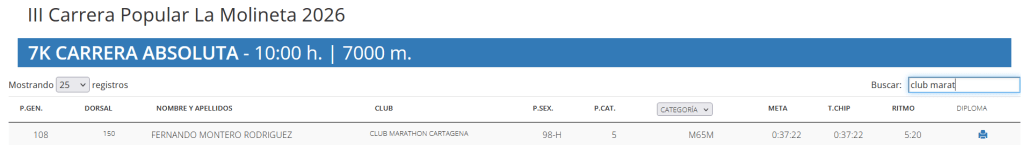 Supersónico Téllez, al que admiro mucho y al que también odio un poquito. Y es que la envidia es muy mala. José Antonio Téllez Almodóvar está de dulce. Tercero en la M55 con un tiempo de 5:40. Cinco minutos y cuarenta segundos. Que alguien haga las cuentas: eso sale a 3’31 por kilómetro. Yo no podría ni corriendo cuesta abajo con viento a favor y habiendo firmado un pacto con el diablo. Téllez lo hace un domingo de febrero como quien va a comprar el pan.