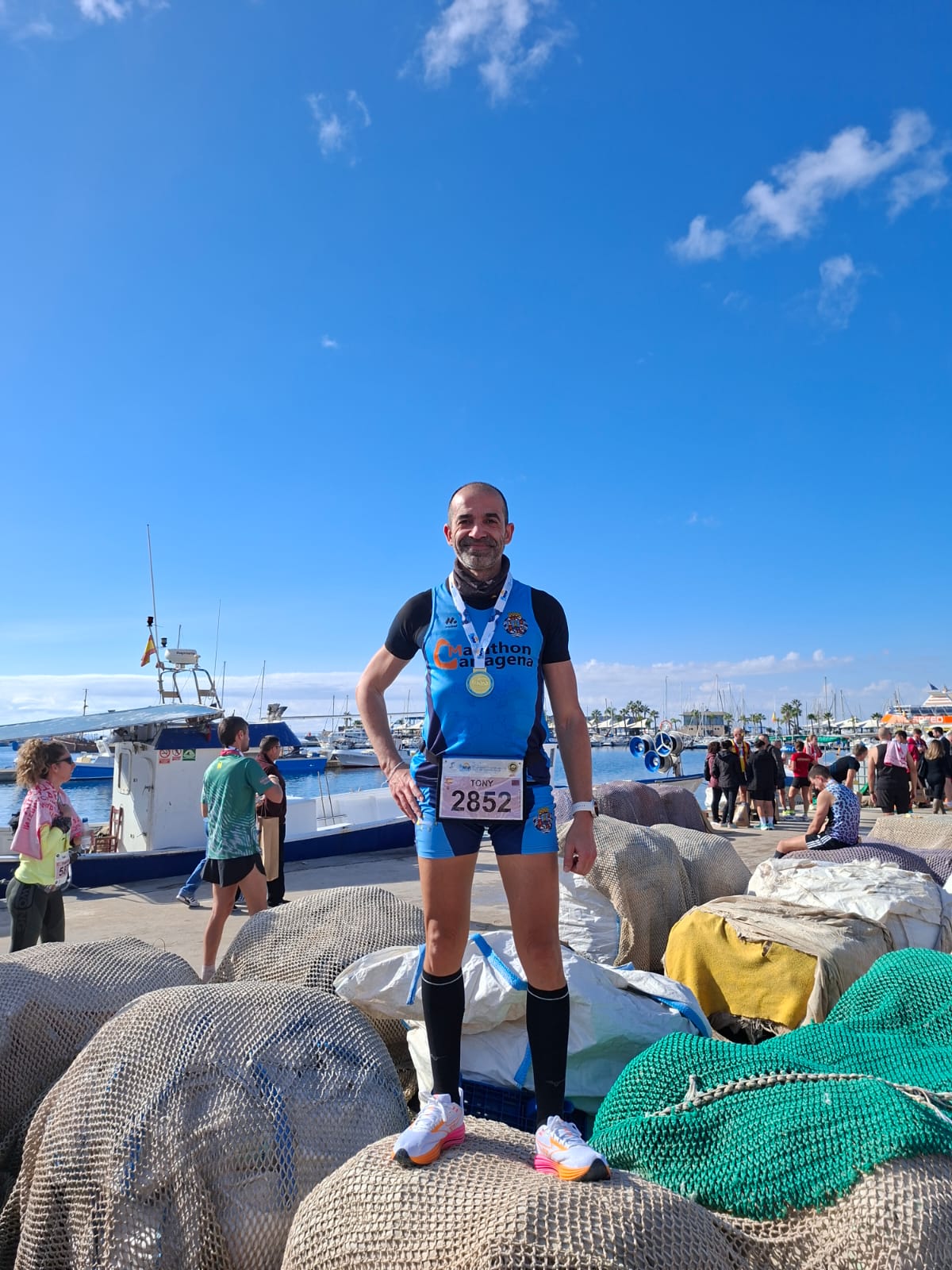 Los nuestros cubrieron las tres distancias —maratón, media maratón y 10K— en un recorrido completamente llano que partía del Ayuntamiento y culminaba a los pies de la Catedral, sede de la Diócesis de… ejem… Cartagena desde 1291. Una catedral con bula papal auténtica, la del Papa Paulo II de 1465, así que técnicamente los corredores que cruzaron la meta tienen indulgencia plenaria. O deberían tenerla. El chip no te lo sellan como en el Camino de Santiago, pero a cambio te dan una medalla de finisher que pesa lo suyo y sirve igual para presumir con los amigos.