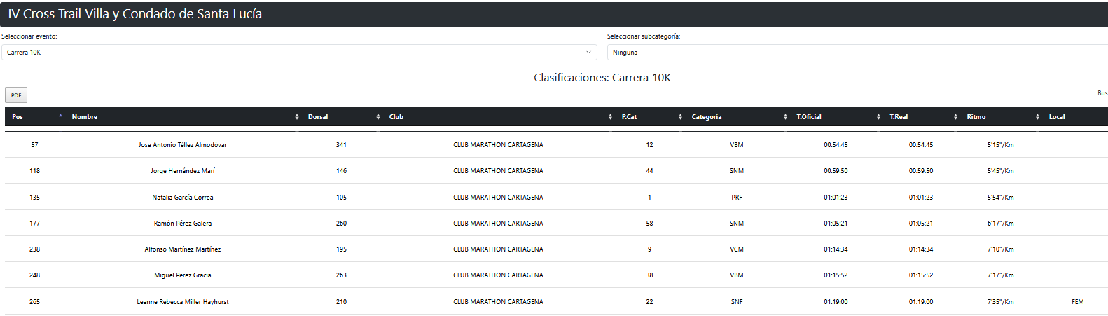 Jorge Hernández Marí completó los diez kilómetros en 59:50 a 5:45/km, puesto 118 de la general. Ramón Pérez Galera cerró en 1:05:21 a 6:17/km en el 177. Alfonso Martínez Martínez, noveno de veteranos C, firmó 1:14:34 a 7:10/km. Y Miguel Pérez Gracia, veterano B, acabó en 1:15:52 a 7:17/km.