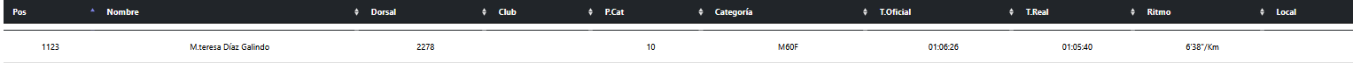 José Antonio Téllez Almodóvar ha vuelto a demostrar que los cincuentaytantos son los nuevos treintaytantos: 1:31:27 a 4’20», noveno de su categoría M55 y puesto 203 de la general. Y Antonio Quiles Cantero, en la categoría M65, se ha marcado un subcampeonato con 1:40:22 a 4’47». Segundo de todos los mayores de 65 de la carrera. Que lo piensen los que dicen que a esa edad hay que dedicarse a la petanca (o al curling, disciplina por cierto a la que estoy pensando en pasarme, después de ver los Juegos Olímpicos del Invierno, total, si solo hay que barrer el hielo con una escoba, seguro que se me da mejor que correr).