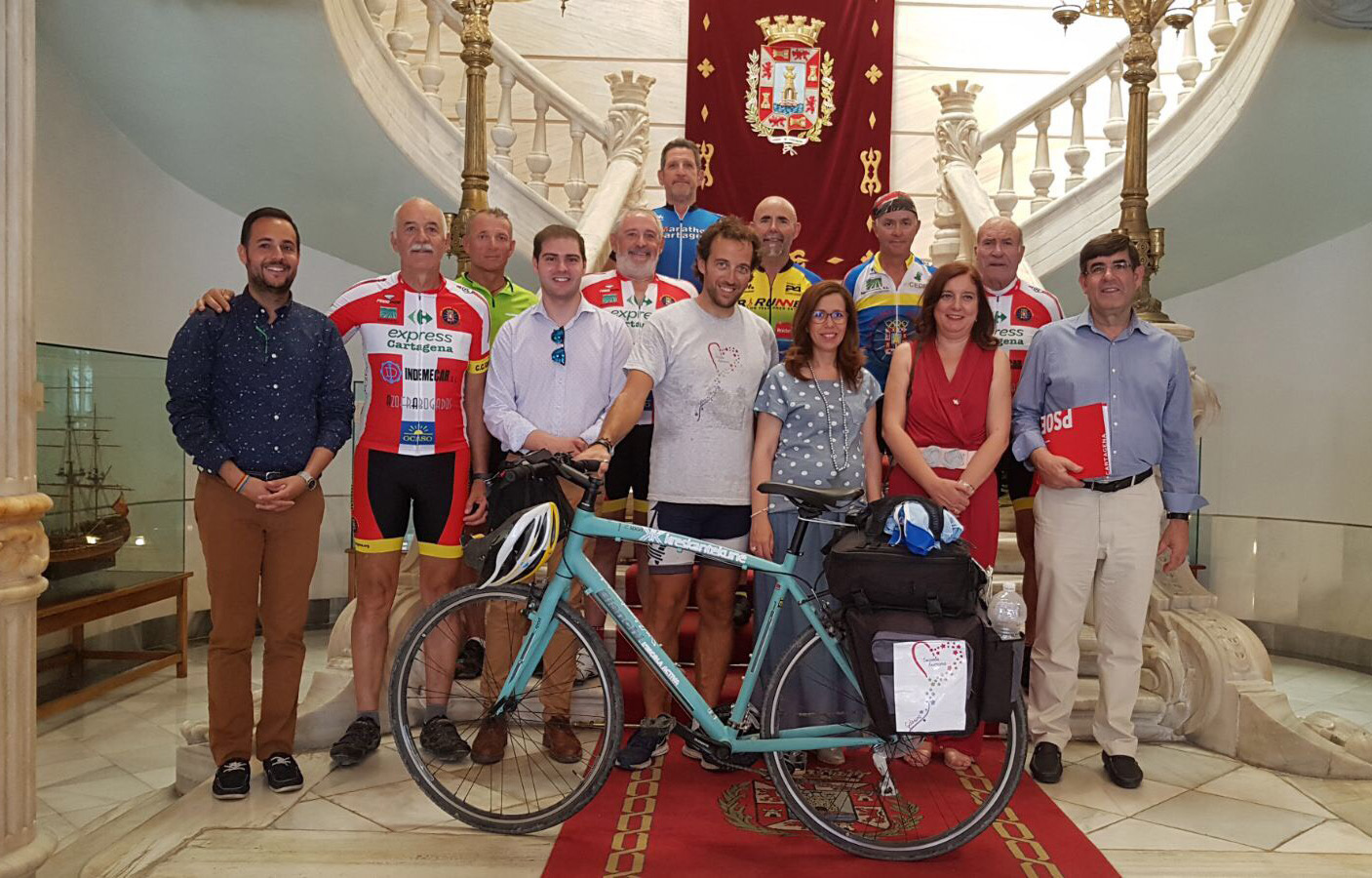 Tras recibir al ciclista italiano Marco, residente en Valencia, a su paso por La Unión, se llegó al Excmo. Ayuntamiento de Cartagena, siendo recibidos por la Alcaldesa de la ciudad Ana Belén Castejón y el Concejal de Deportes, Ricardo Segado, entre otras autoridades municipales.