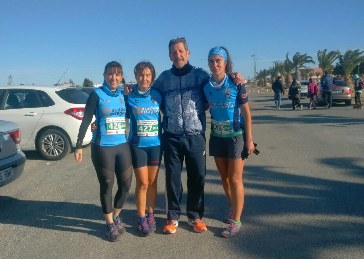 Representación del club Marathón Cartagena, en sus categorías, de Daniel Sánchez Espejo (3º veterano M60), Ana García Martínez (4ª veterana F40), Olga Rodríguez Arnaldo (4ª veterana F50) y Mª Carmen López Fraga (1ª veterana F55).