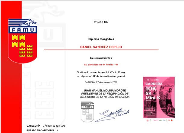 En la Carrera 10 Km. Floración de Cieza (Murcia) participó Daniel Sánchez Espejo, en representación del club Marathón Cartagena.