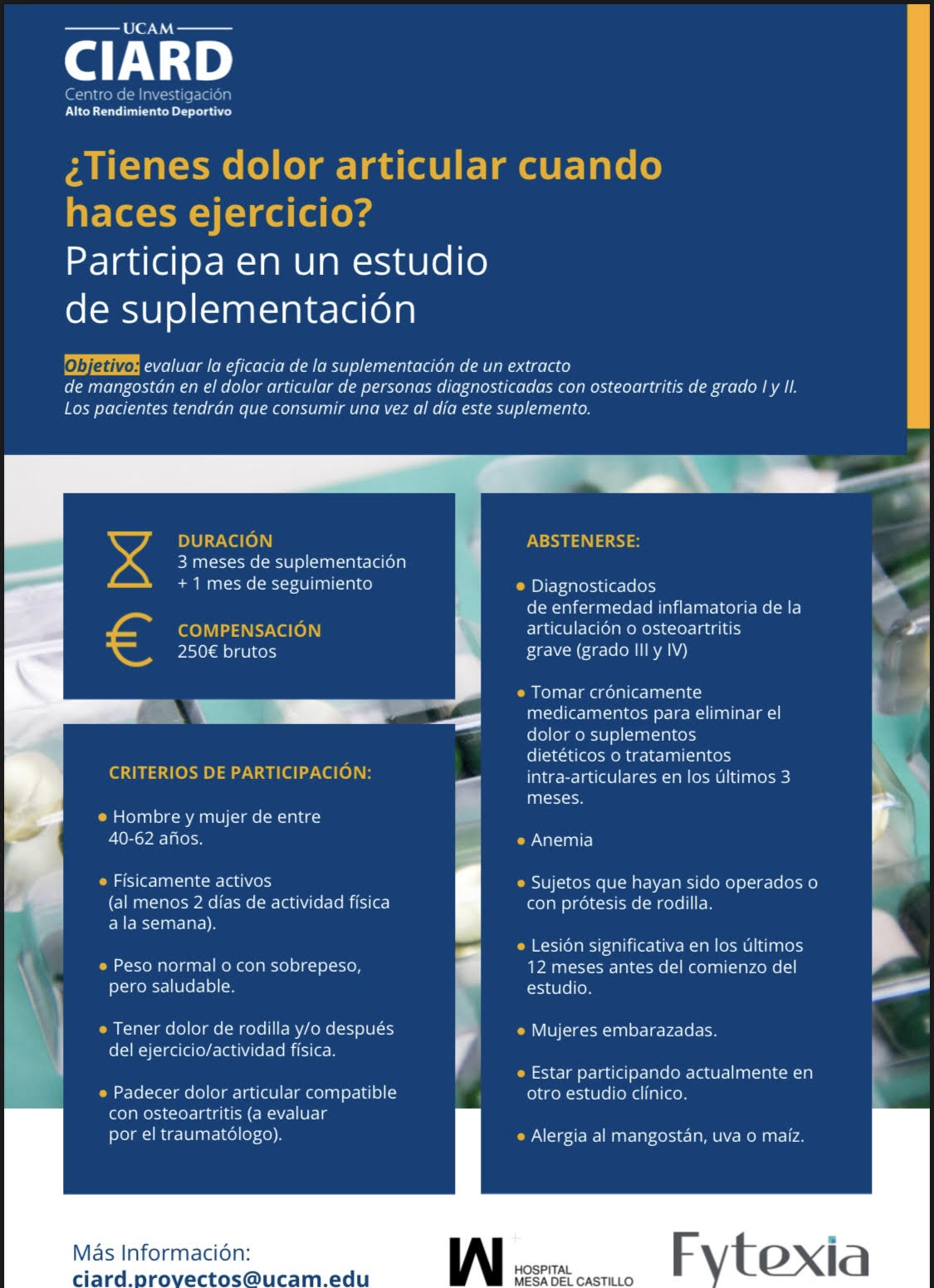 El estudio consiste en 3 meses de suplementación y 1 mes de seguimiento. El centro donde se realizará el estudio (CIARD-UCAM), tomará todas las medidas COVID oportunas de seguridad establecidas por la Universidad y organismos oficiales