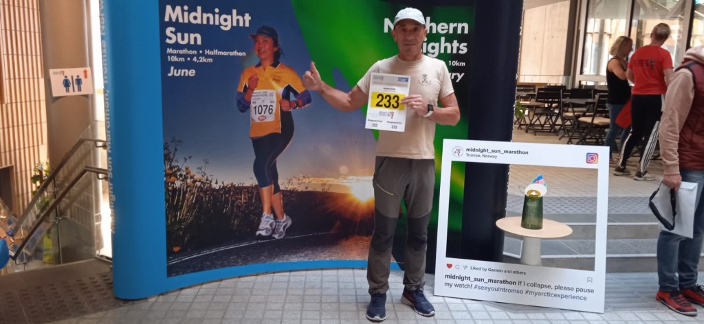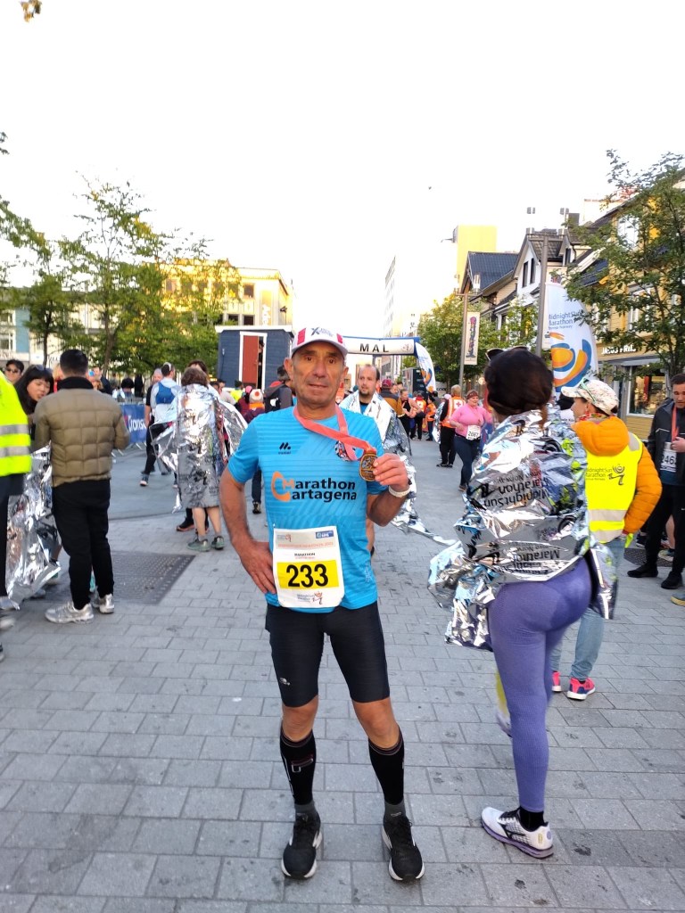 Mi tiempo fue bastante discreto 4:35 según mi reloj tengo que decir que sufrí un problema estomacal y sufrí bastante las consecuencias no pude tomar nada en toda la carrera y pare donde pude un montón de veces para aliviar los retorcijones y los vómitos . Bueno llegue que es lo importante con esta alcanzó la cifra de 40 maratones y ahora a por 50 si se puede. Un saludo desde Tromsø.