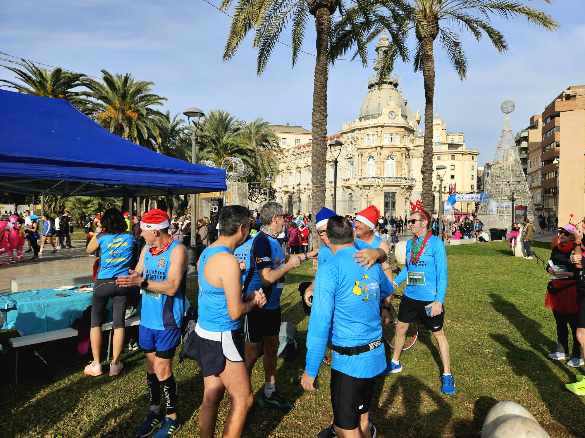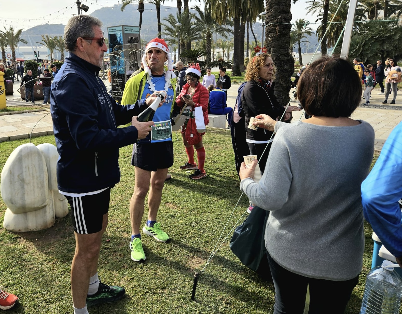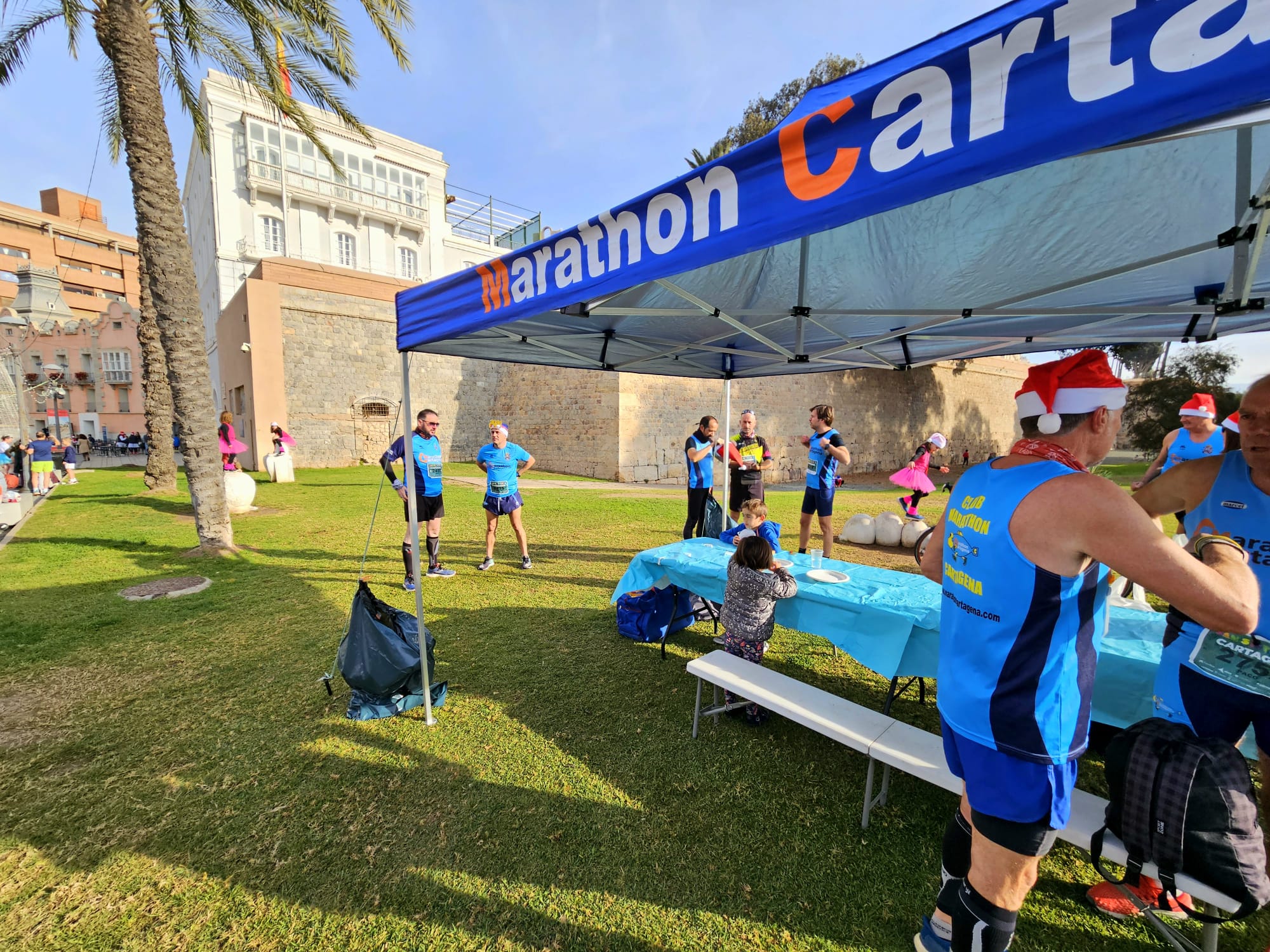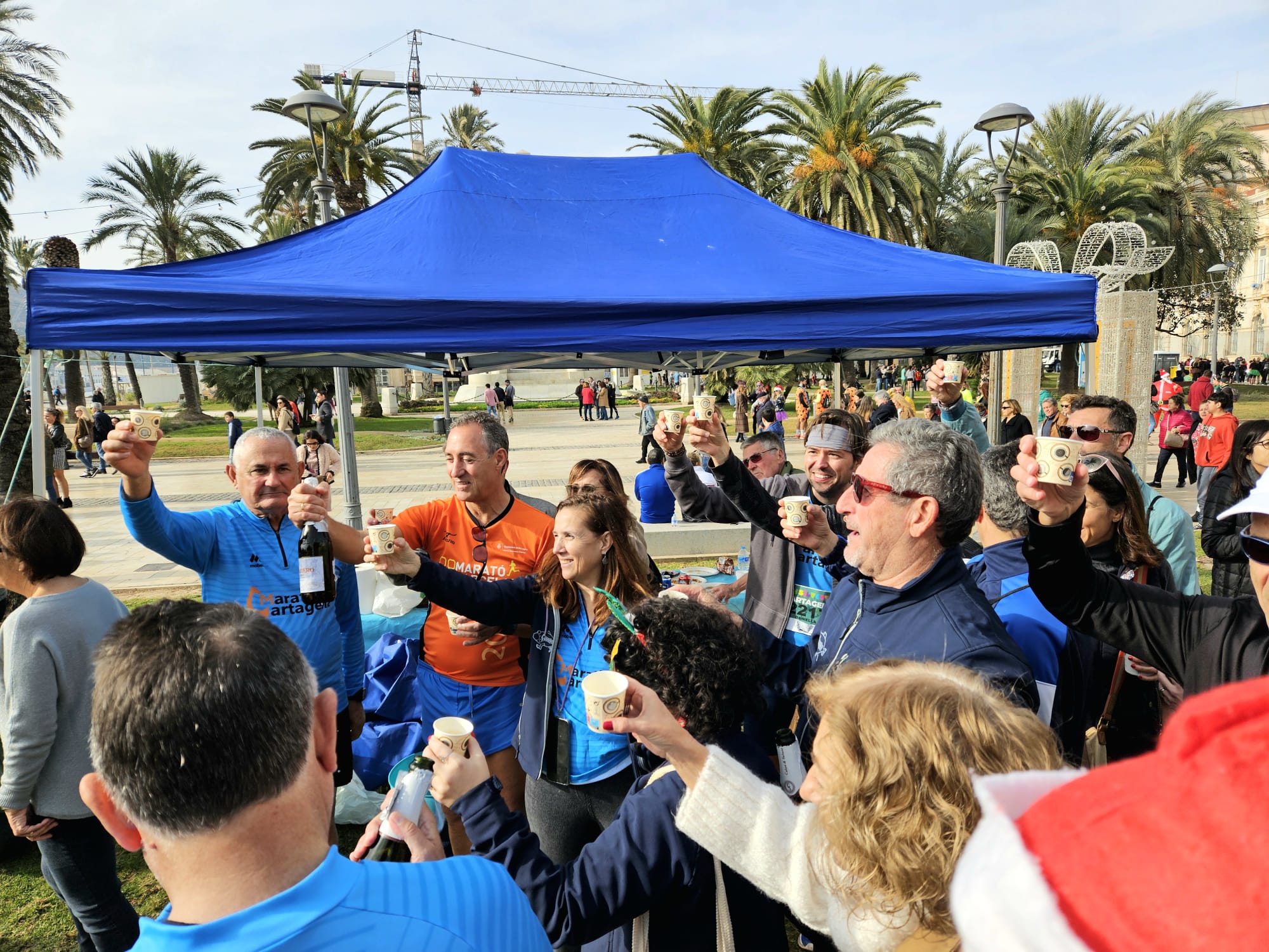 Tras la carrera despedimos el año con refrescos, cervezas, aperitivos varios, dulces navideños y cava, en la carpa del club Marathón Cartagena.