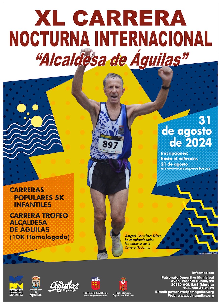 En Águilas, junto a Lorca, meca del atletismo popular regional, se celebró el ppdo. 31 Agosto en horario vespertino la XL Edición, con precios de inscripción a 5 € y gratis para categorías infantiles, y la participación de Leandro Miras Ontiveros (24:59) 1° MASTER70 . en 5K.