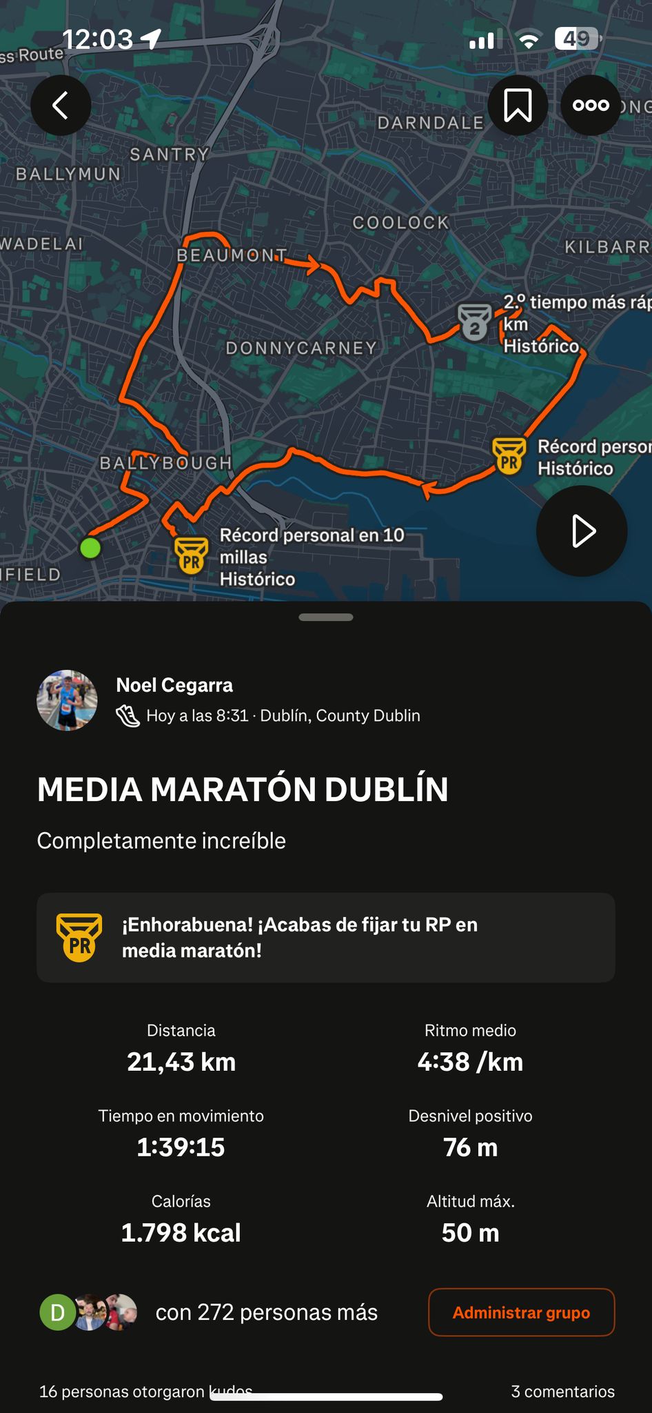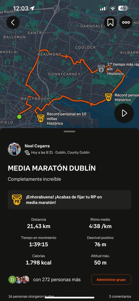 En la » soleada » jornada dominguera del día 30/3/2025 participó Noel Cegarra Lloret 1:39:15, según su cronómetro gps, en la » Half Marathon » de la capital de la República de Irlanda a orillas del río Liffey con más 11.000 participantes.