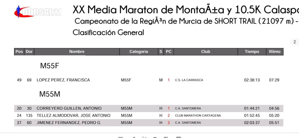 Prueba incluida en el Cto. Región de Murcia Short Trail. Nuestro compañero José Antonio Téllez Almodóvar 1:52:45 compitió el ppdo. Domingo día 6 Abril en dicha prueba con un 2º puesto Cat. M55M.