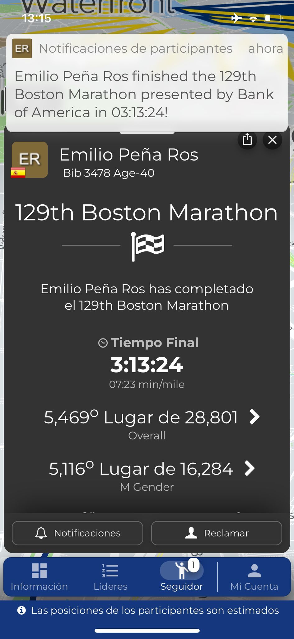 » Para vosotros ayer para mi todavia hoy, he tenido la suerte, y el placer , de correr el 129 maratón de Boston. Una carrera increíble «… ésta es la nota que nos envió Emilio .