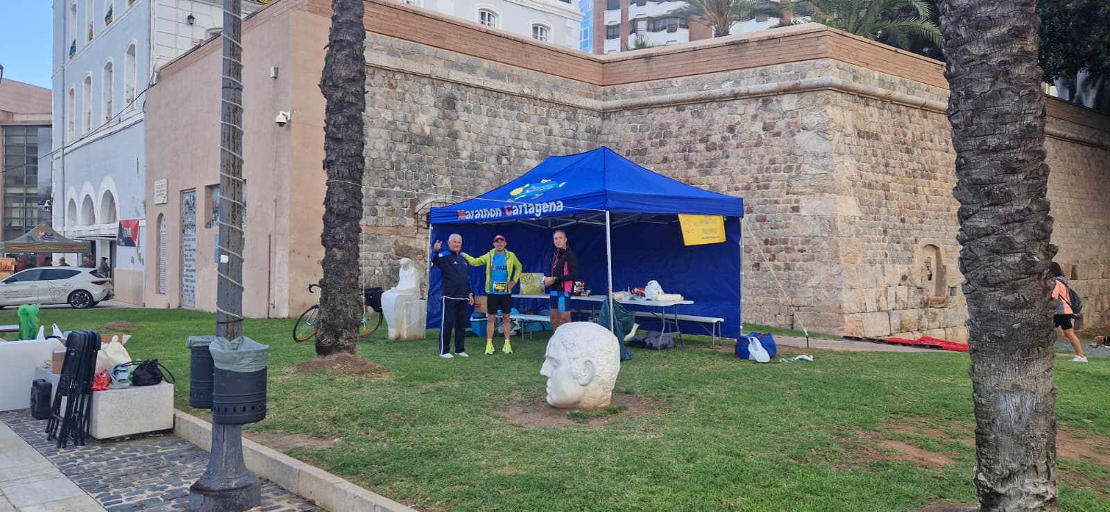 Como manda la tradición, el Club Maratón Cartagena no iba a presentarse sin su cuartel general a pie de meta. Mientras la mayoría de Cartagena aún dormía, Miguel Camino y un puñado de voluntarios madrugadores se plantaron en el Paseo de Alfonso XII cuando todavía había más sombras que luz.