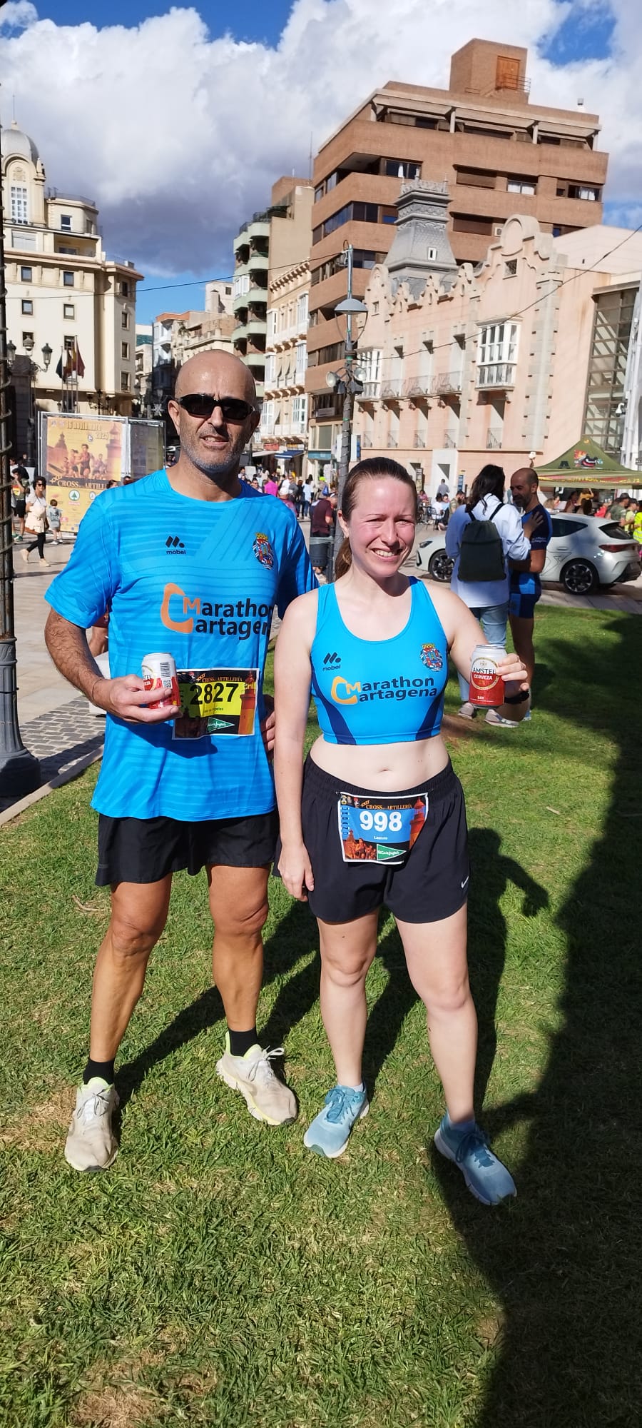 Javi, nuestro nuevo socio, y Leanne Rebecca Miller Hayhurst reponiéndose tras cruzar meta. Después de 14 y 6 kilómetros respectivamente, un isotónico sabe a gloria.