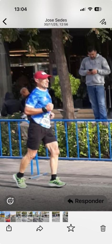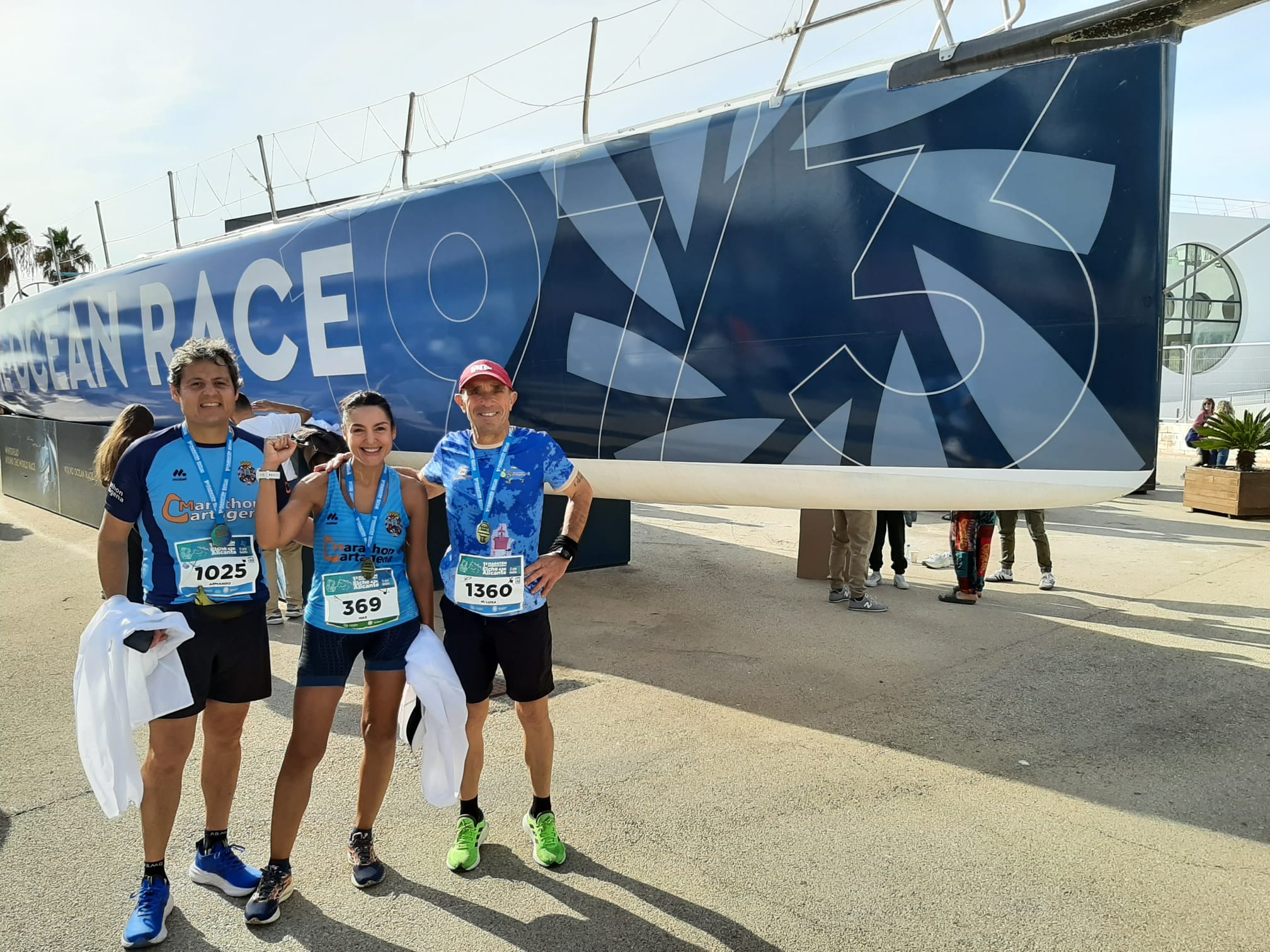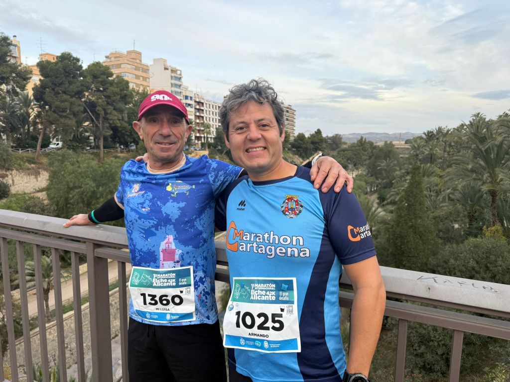 Y luego estaba el tapado. Armando Mayordomo, que completó los 42 kilómetros en 4:12:25, y era el corredor sorpresa porque nadie sabía (excepto Camero) que iba a estar allí. Y eso que hace apenas siete días corrió el Maratón de Donostia. Dos semanas. Dos maratones. ¡Y va a por el tercero! El de Valencia, donde vive (Armando es nuestro cónsul cartaginés en Catarroja), el domingo que viene. Aquí propongo lanzar una microcampaña para conseguirle un bono de descarga de piernas en algún fisio, o al menos un vale para el Decathlon, porque a este paso va a necesitar renovar zapatillas cada mes.