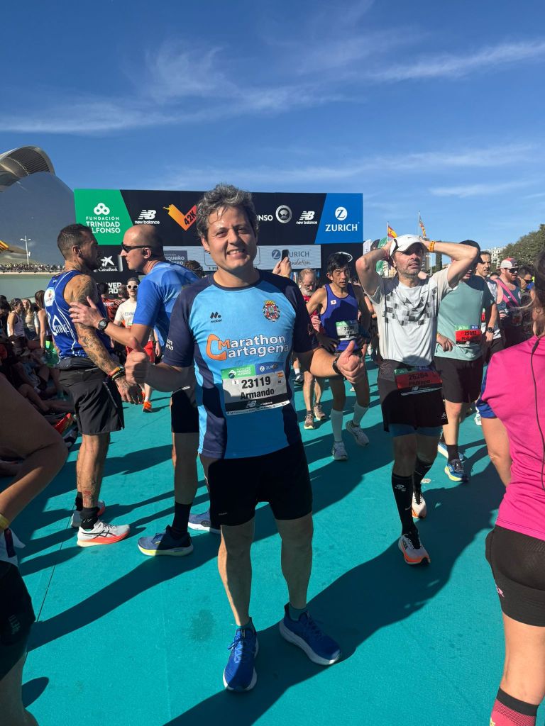 Y luego está Armando Mayordomo. Un caso aparte. Armando ha completado tres maratones en tres semanas. Sí, has leído bien: tres maratones en veintiún días. La de Valencia fue la última, con un tiempo de 4:08:05. No sé si Armando necesita un fisioterapeuta o un psicólogo, pero desde aquí le mandamos un abrazo y nuestra más sincera preocupación. En el buen sentido. Armando, ya has cumplido hasta después de Navidad. Tienes permiso para darte unos cuantos homenajes en estas fiestas, que los músculos hay que cargarlos de glúcogeno.