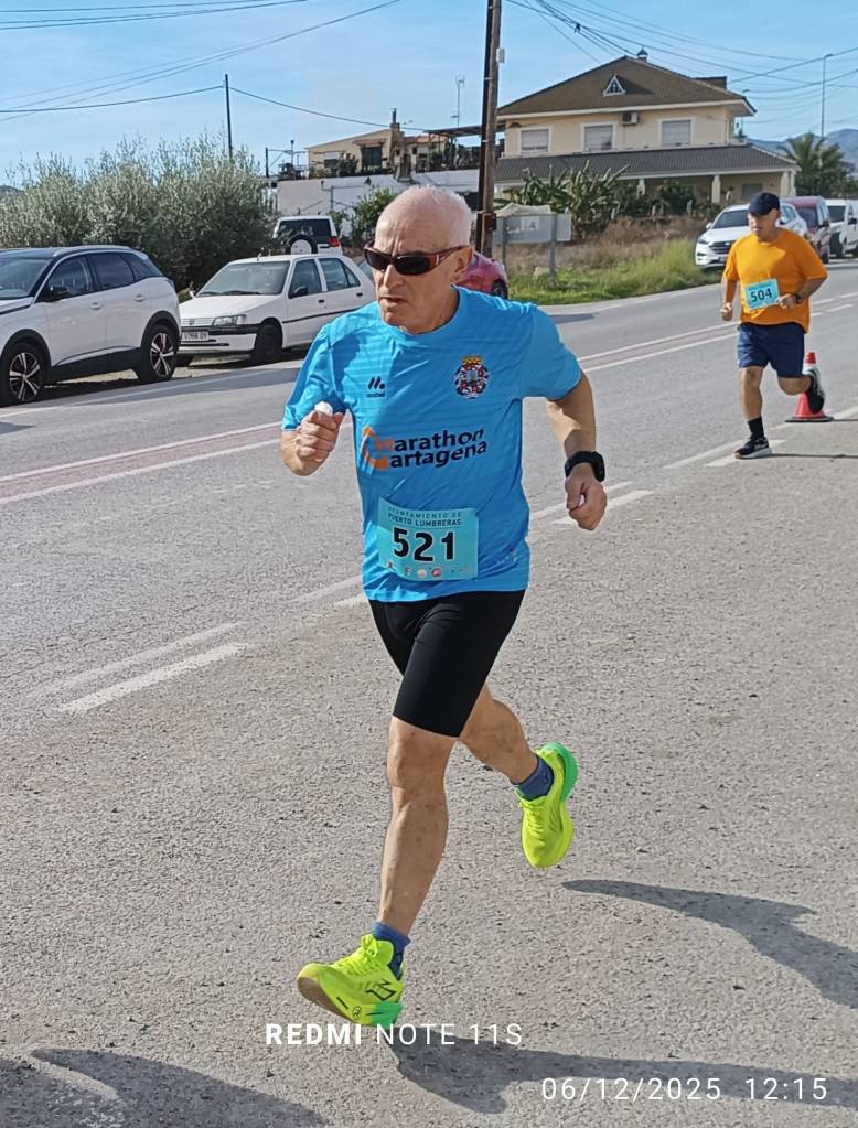 En Puerto Lumbreras, cinco mil metros en un circuito de cinco vueltas, Leandro Miras se subió al tercer puesto del podio en la categoría M70 con un crono de 24:18, a un ritmo de 04:56 min/km. A ver, lo voy a repetir porque me parece increíble. Más de 70 años, menos de 5 minutos por kilómetro. Leandro, otro de los históricos del club, sigue demostrando que la edad es solo un número. Y me da mucha envidia.