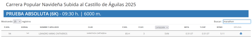 Leandro Miras lleva unos años jubilado de la recepción del Hotel Carlos III, pero no para quieto. El 21 de diciembre se plantó en Águilas para la Carrera Popular de Navidad, que tiene subida al mirador del Pico de L’Aguilica y al Castillo de San Juan de las Águilas. Solo ver la foto de esa cuesta me da taquicardia.