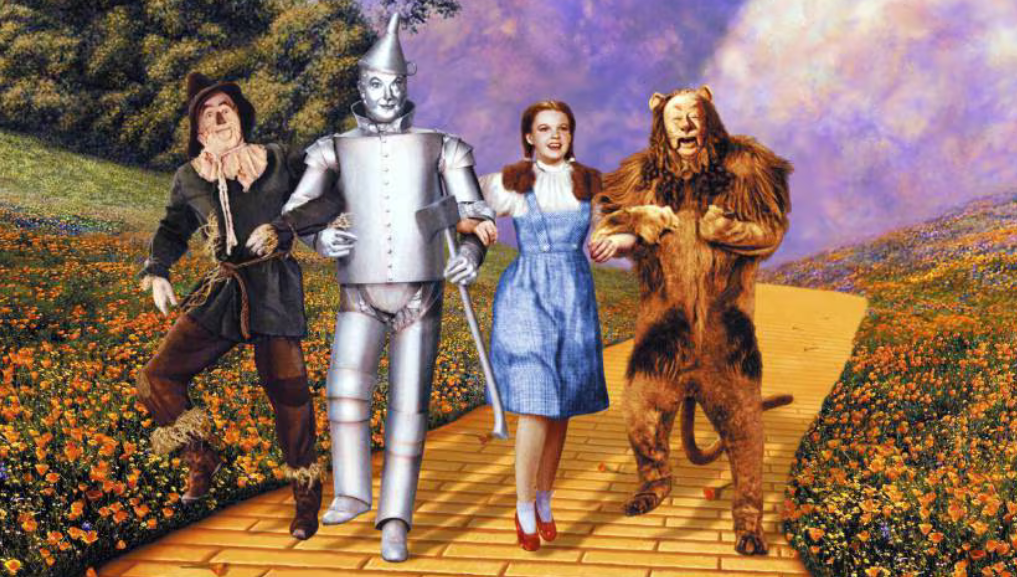 Foto 1: El Mago de Oz (fotograma original – Dorothy, león cobarde, espantapájaros, hombre de hojalata, todos juntos en el camino de las baldosas amarillas)