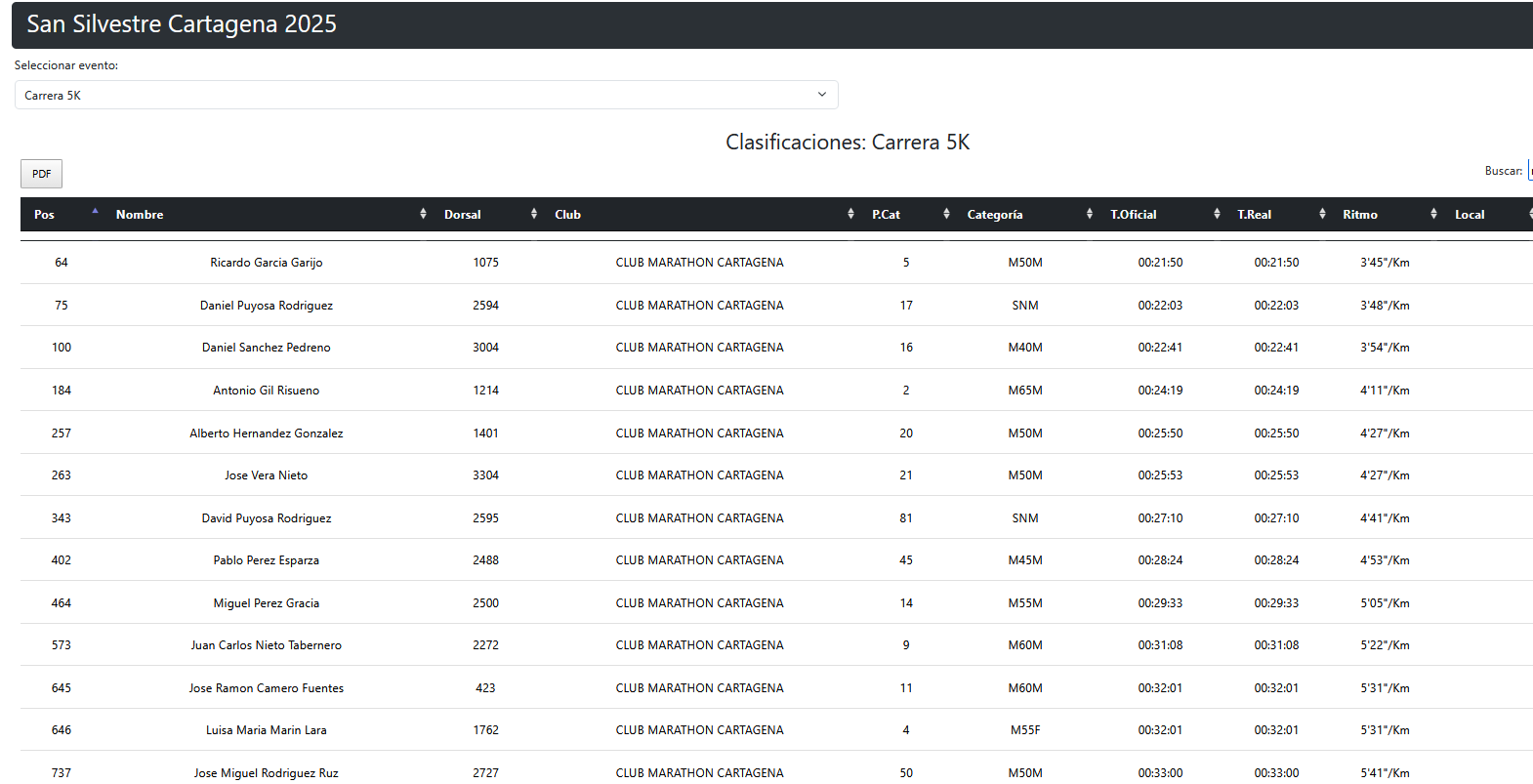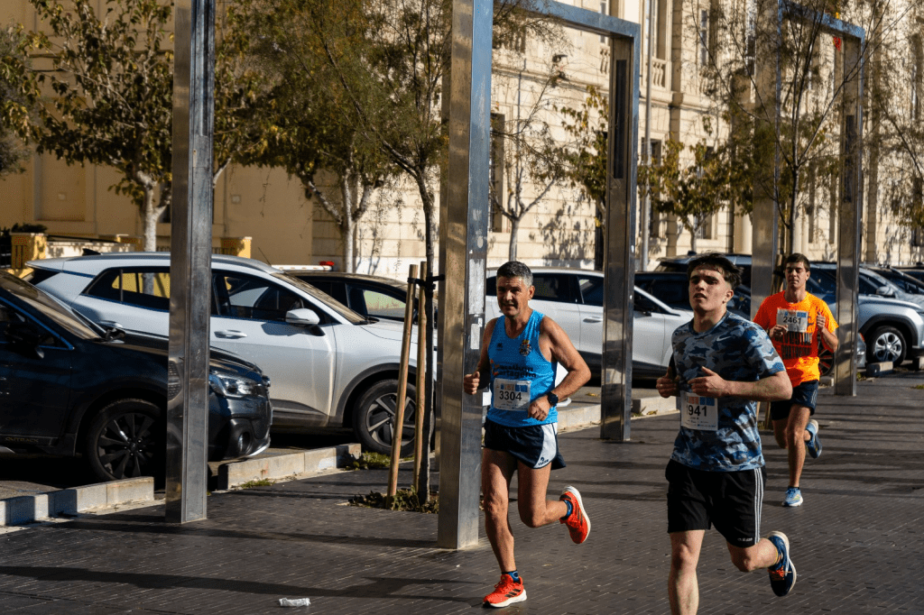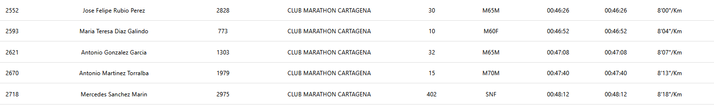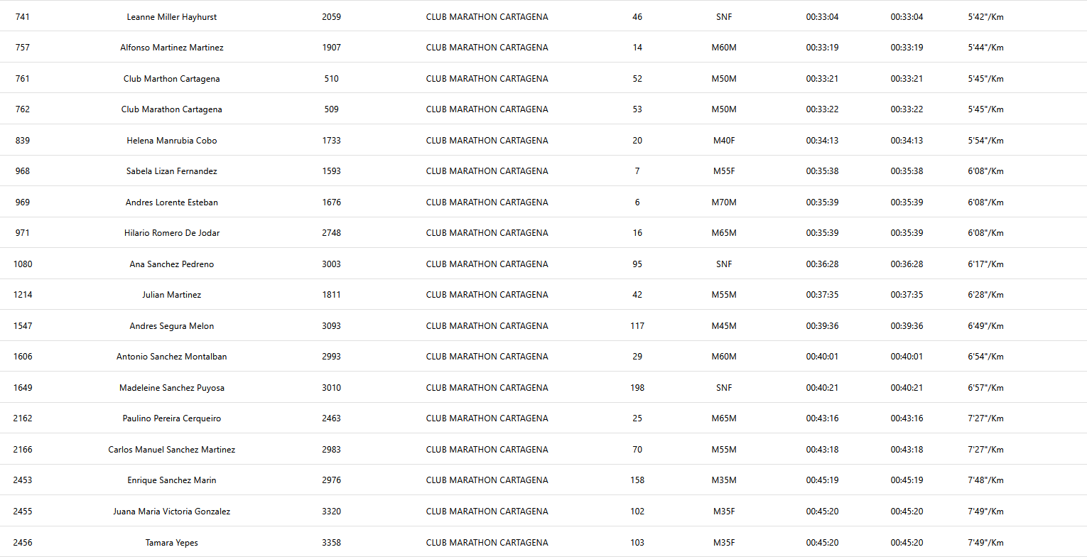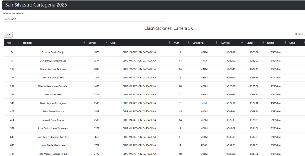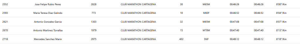 Ricardo García, nuestro mejor clasificado, un año más… Volando a 3.45.Daniel Puyosa, otro ‘bala’… A 3.48.Daniel Sánchez también bajó de los 4 min/k.Al fondo, Antonio Gil (creo). Por la pinta de velocidad… Si es él, fue 2º en M65M.José Vera, quien tuvo, retuvo… A 4.27.Alberto Hernández, otro que tal… También a 4.27.David Puyosa enfila los metros finales. El ‘lento’ de la saga negocia los 4.47, pero no hay piedad en la cena familiar.Miguel Pérez. Sufriendo (un poquito) a 5.05.Leanne, as usual, no se deja nada…Camero y Luisa, la pareja que corre unida… (Luisa casi sube al podio, 4ª en su categoría).José Miguel Rodríguez, muy enchufado.Juanki, dosificándose.La ‘community’, de tranqui.Sabela, de naranja, escoltada por sus pretorianos.Alfonso Martínez, procurando no pisar las hormigas.A Hilario se le escapa el trineo…Andrés, corriendo y meditando junto a su sensei.Hilario Romero y Andrés Lorente. Peral los cría y ellos se juntan.Paulino Pereira se lo pasa de miedo.Ana Sánchez, animosa y animada.Antonio González derrochando simpatía.Julián Martínez viendo la meta en lontananza.Antonio Sánchez Montalbán (izda), con los amigos.