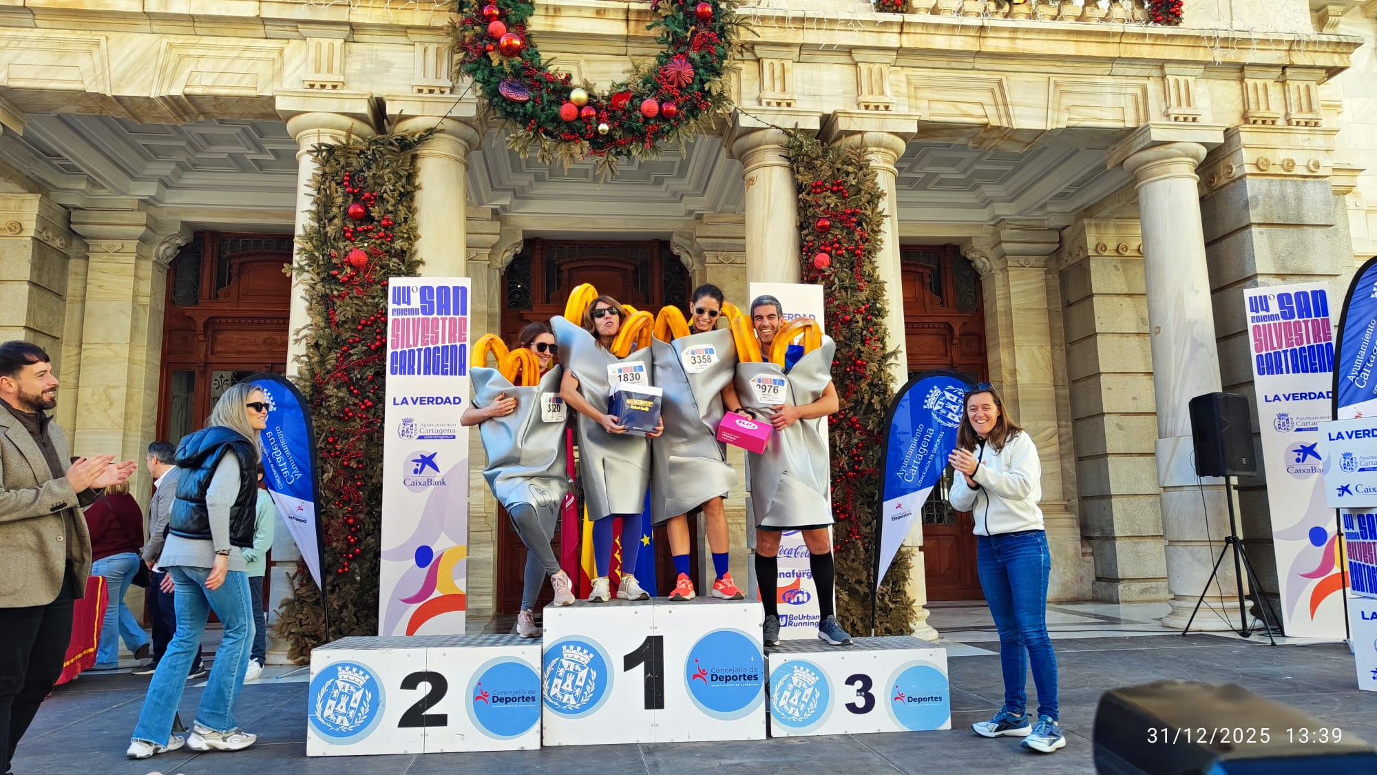 La familia que desayuna unida… Primer premio al mejor disfraz colectivo por tercer año consecutivo. Enhorabuena a Tamara, Enrique, Juanamari y Laura (si no me equivoco).Tamara derramando azúcar a Leanne y Andrés. Menos mal que ya venían desayunados.Nuestros tres galgos: Ricardo (5º en M50M), Daniel y Daniel.Antonio Martínez, the ‘number one’.Juanki, recién llegado del rodaje de ‘Ocho apellidos colchoneros’, se los enumera a un Peralico: «Aragonés, Gárate, Reina, Pantic, Futre, Simeone, Torres, Kiko.» «No, Kiko no es un apellido…»Antonio y Camero, dos cracks.Nuestro departamento de Informática, siempre a su servicio.Madeleine, con los Puyosa bros.¡Feliz 2026!