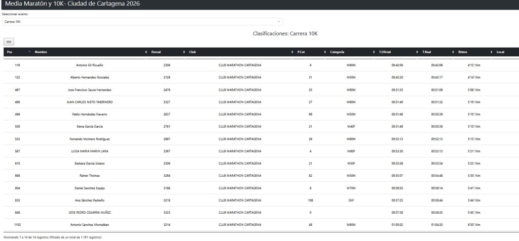 Mención especial para nuestro peralico montonero, Daniel Sánchez Espejo, que ha firmado un 56:14 en la categoría M70. Reiner Thomas (54:48), Ana Sánchez Pedreño (56:44), José Pedro Cegarra Núñez (56:25) y Antonio Sánchez Montalbán (1:04:20) completan la representación peralica en el 10K.