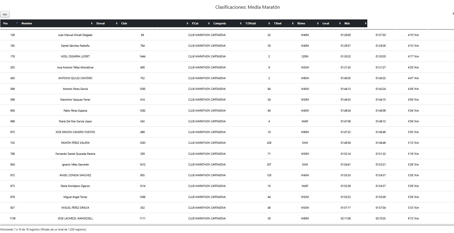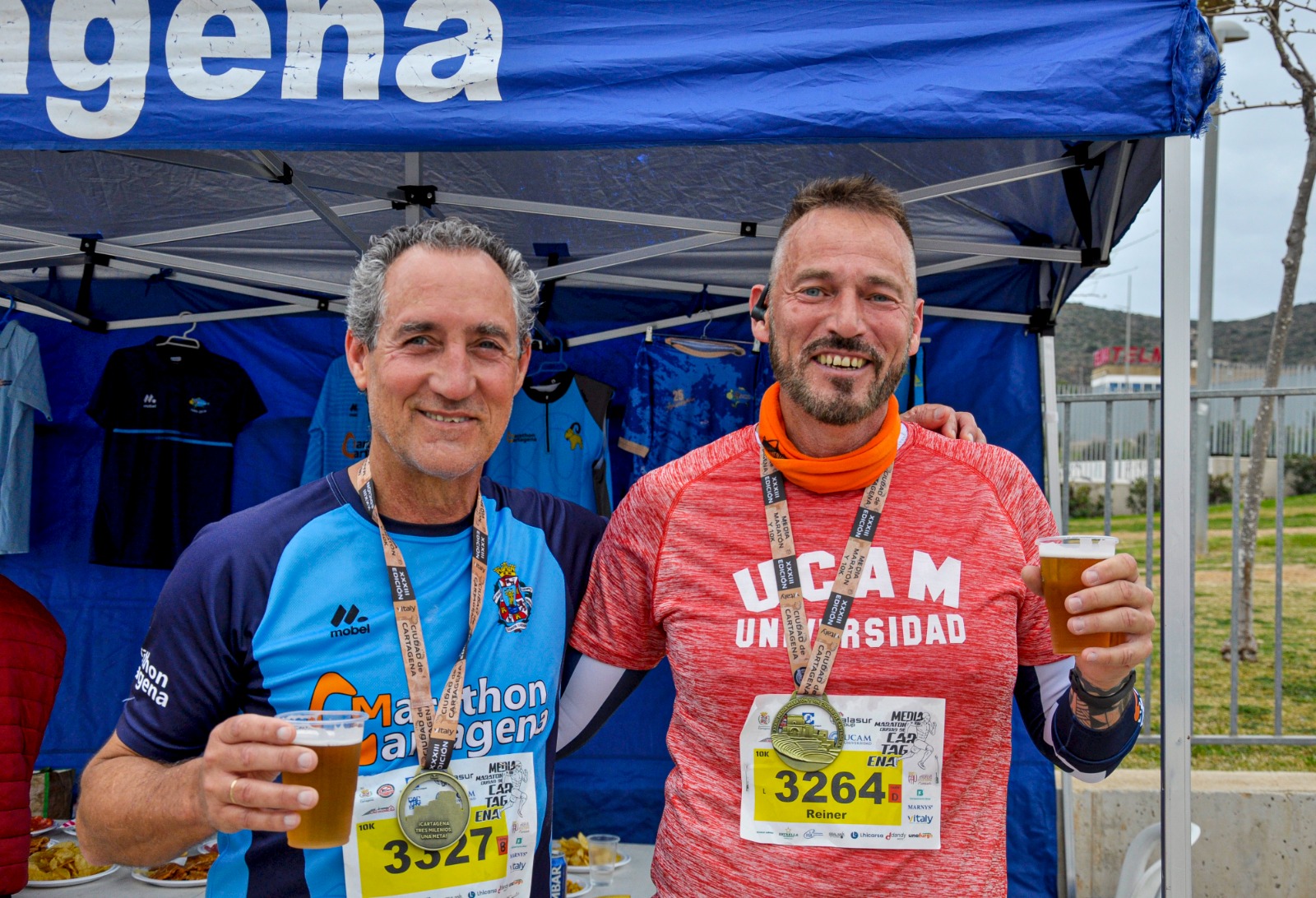 Ramón Pérez Galera (1:49:46), Fernando Daniel Quesada Pereira (1:51:32), Ignacio Vélez Garcerán (1:53:21) y la pareja formada por Ángel Conesa Sánchez y Paola Montijano Ogeron —que han cruzado la meta con el mismo tiempo, 1:54:37— han completado un grupo compacto en el que nadie ha bajado del 5’30». Miguel Ángel Torres (1:55:00), Miguel Pérez Gracia (1:57:04) y José Lacarcel Wandosell, que ha cerrado la representación peralica en la media con 2:10:35, completan la nómina de los dieciocho valientes que se han comido los veintiún kilómetros de rigor.