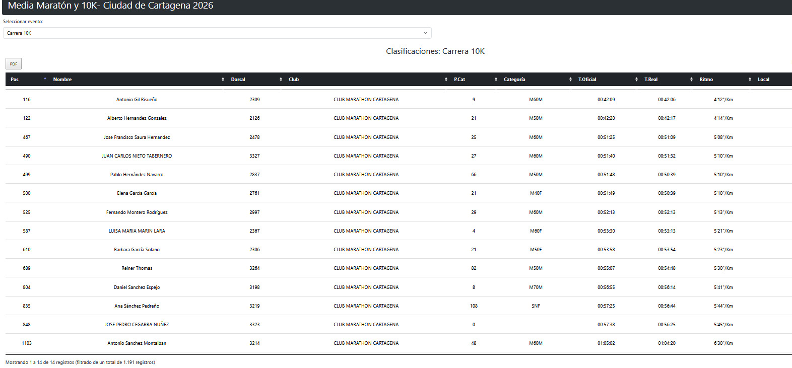 José Francisco Saura Hernández (51:09), Juan Carlos Nieto Tabernero, Juanki, (51:32), Pablo Hernández Navarro y Elena García García —ambos con 50:39, otro empate parejil de los que dan para tertulias del corazón— y Fernando Montero Rodríguez (52:13) han completado la zona media del grupo. Luisa María Marín Lara se ha apuntado un cuarto puesto en la categoría M60 femenina con 53:13, y Bárbara García Solano ha cerrado en 53:54.