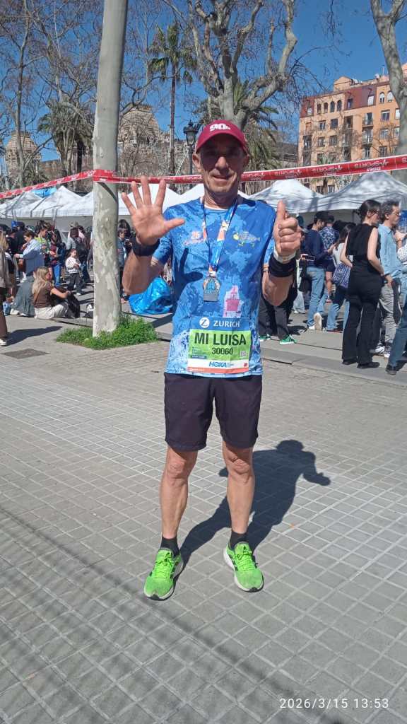 José Ramón Camero lleva el nombre de Luisa en el dorsal. Hay quien dice que detrás de cada gran hombre hay una gran mujer, que es una frase que suena bonita pero que a mí me parece una chorrada. Primero porque hay más (muchas más) grandes mujeres que hombres, al menos esa es mi experiencia. Y cuando se juntan un gran hombre y una gran mujer, eso no implica que una de las dos personas vaya detrás. Y cualquiera que haya visto a Camero y a Luisa correr juntos sabe que van al lado, que es como van las parejas que funcionan. La Zurich Marató de Barcelona ha sido este domingo la número sesenta de Camero, y la ha corrido con esas dos palabras escritas sobre la camiseta azul: Mi Luisa.
