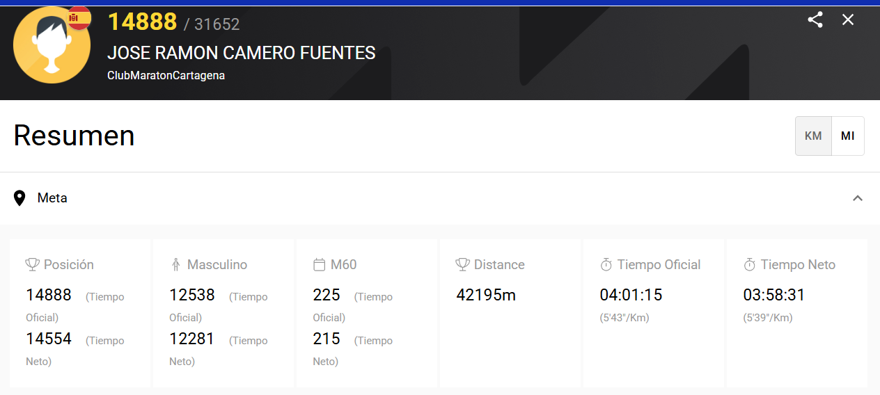 Camero ha cruzado la meta con un tiempo neto de 3:58:31, por debajo de las cuatro horas, a ritmo de 5:39 el kilómetro. Su maratón número sesenta. Seis-cero. En la categoría M60 ha entrado el 215 de los que acabaron. No es que Camero compita contra nadie a estas alturas, pero el dato está ahí para quien quiera valorar lo que significa bajar de cuatro horas en tu sexagésima maratón con más de sesenta años. Honor y gloria para nuestro José Ramón y su Luisa. Hay que quedar a tomar una cerveza para comentar la hazaña.