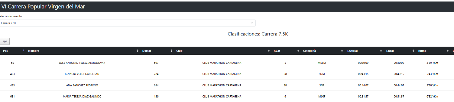 Téllez volvió a hacer lo que Téllez hace siempre: correr como si tuviera veinte años menos y dejar a la gente preguntándose qué desayuna. Puesto 65 de la general, quinto de la categoría M55, 30 minutos y 9 segundos a un ritmo de 3:59 el kilómetro. Ignacio Vélez Garcerán completó la prueba en 43:15, Ana Sánchez Pedreño en 44:07, y María Teresa Díaz Galindo cerró la representación peralica con 51:57 en la categoría M60 femenina, novena de su categoría.
