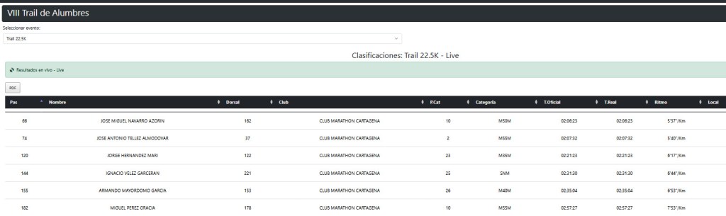 El propio Jorge, el del embutido, completó la distancia en 2:21:23 a 6’17», y confesó por el grupo que a cierta altura del recorrido no paraba de preguntarse por qué se había apuntado a los 22 y no a los 18, que son el tipo de reflexiones existenciales que produce un trail cuando llevas dos horas machacándote en una sierra y empiezas a sospechar que la versión corta de la prueba también incluía todos los paisajes bonitos pero con cuatro kilómetros menos de penitencia. Le siguieron Ignacio Vélez Garcerán (2:31:30, a 6’44»), Armando Mayordomo García (2:35:04, a 6’53»), que vino desde tierras valencianas, y Miguel Pérez Gracia, cerrando la representación en la larga con 2:57:27 a 7’53».