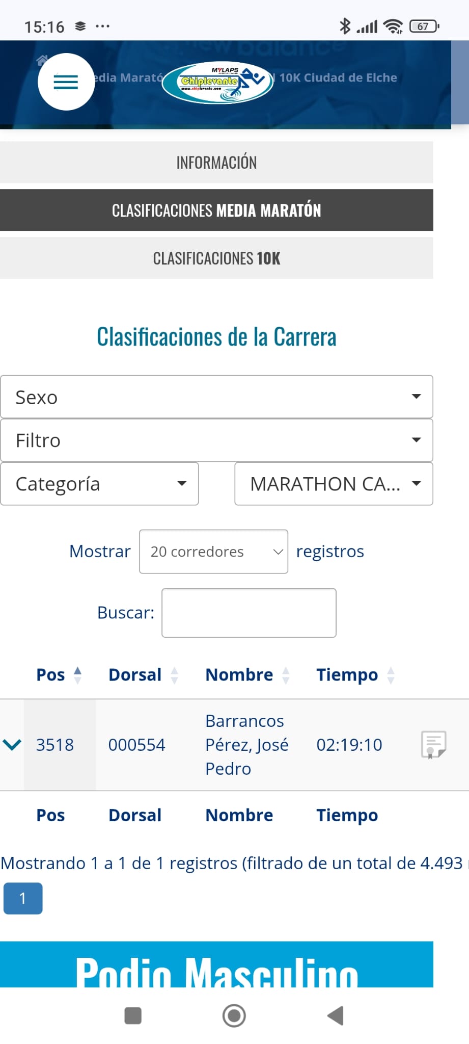 José Pedro Barrancos Pérez representó al Club Maratón Cartagena entre los 4.500 corredores de la media y cruzó la meta con 2:19:10. Su resumen es un ejercicio de concisión: «Jo, qué calor.» Los últimos kilómetros, confiesa, se le hicieron eternos, que es la forma cortés de decir que el sol ilicitano en marzo aprieta como si ya fuese junio, pero rescató del sufrimiento un tramo entre palmeras que le arrancó un «genial» sin reservas. La Media de Elche, con sus casi seis décadas de historia y su recorrido prácticamente plano, es una de esas pruebas que todo corredor popular debería hacer al menos una vez.
